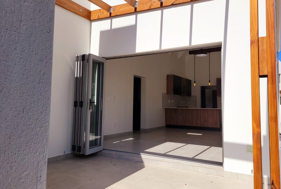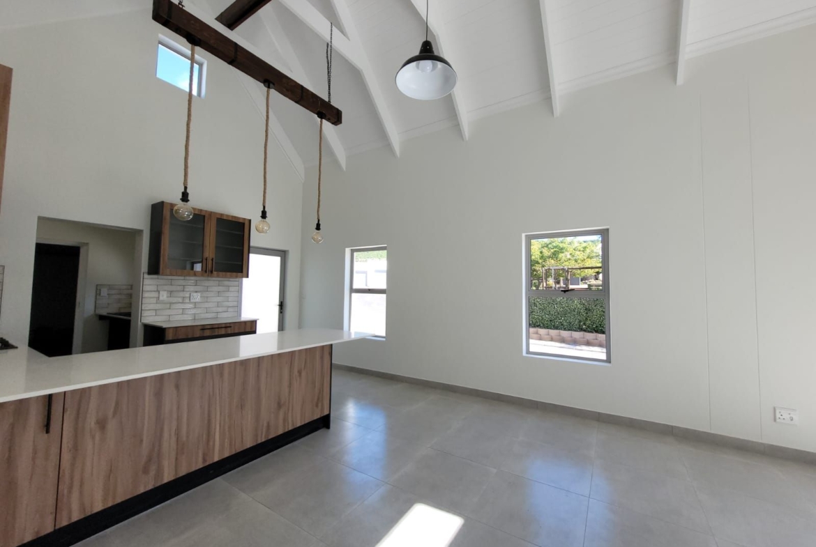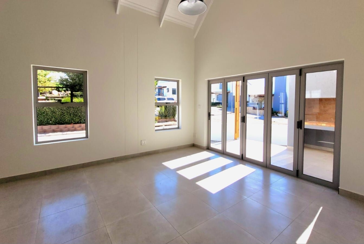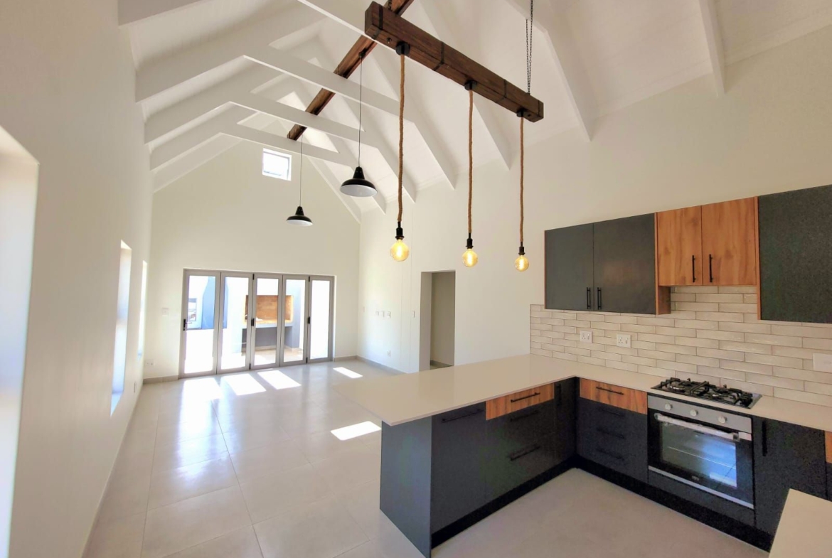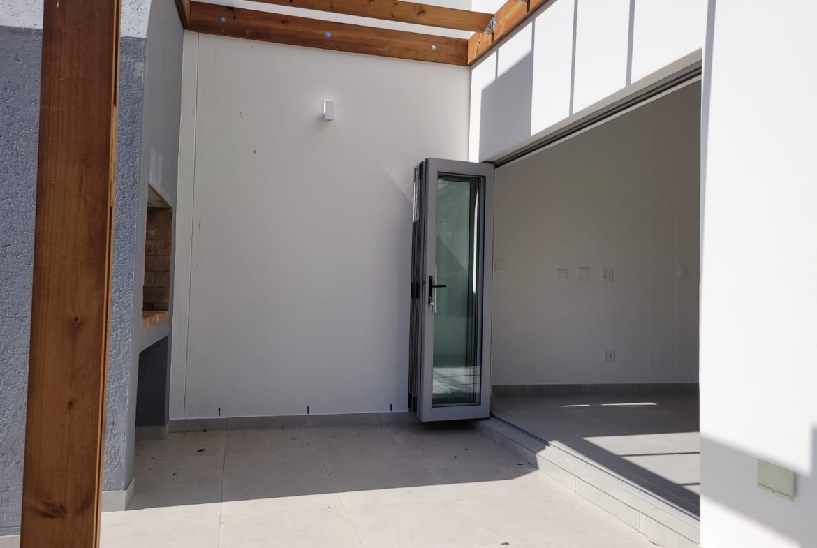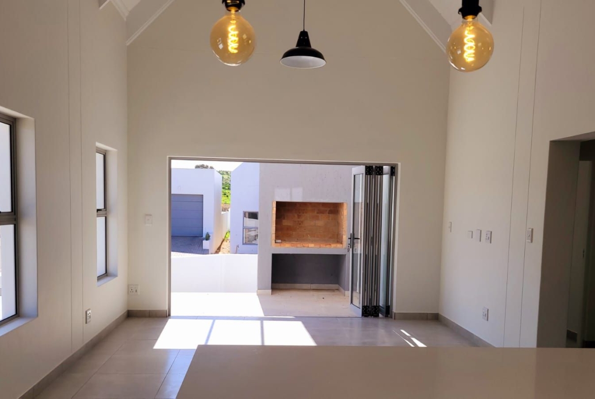 The heart of the home is its open-plan kitchen and living area, a space designed for connection. Stacking doors open onto a sunlit patio, seamlessly blending the indoors with the outdoors. The built-in braai turns everyday living into an experience of fresh air, sunshine, and the gentle sounds of nature.