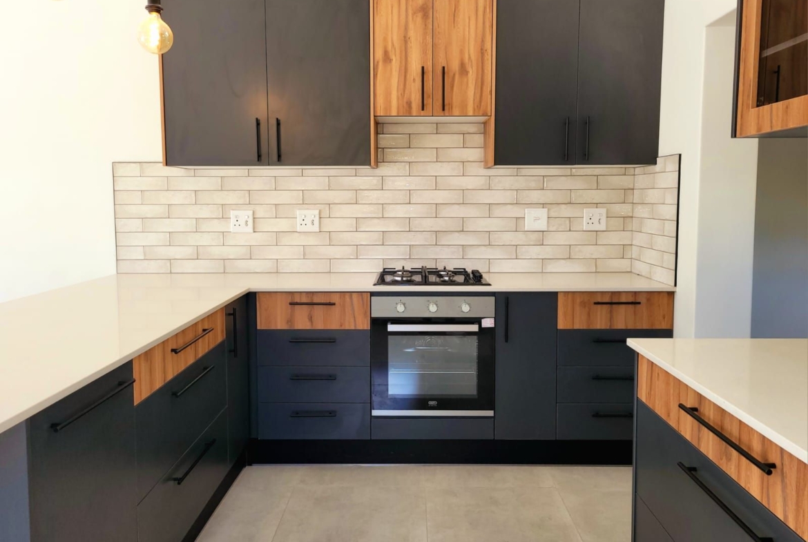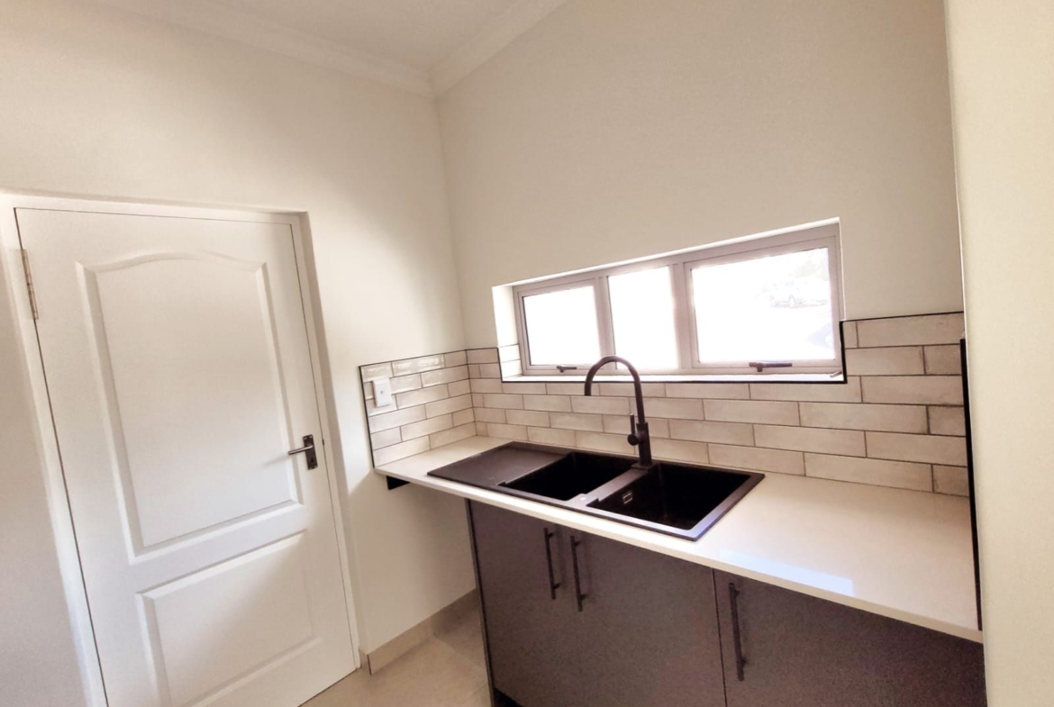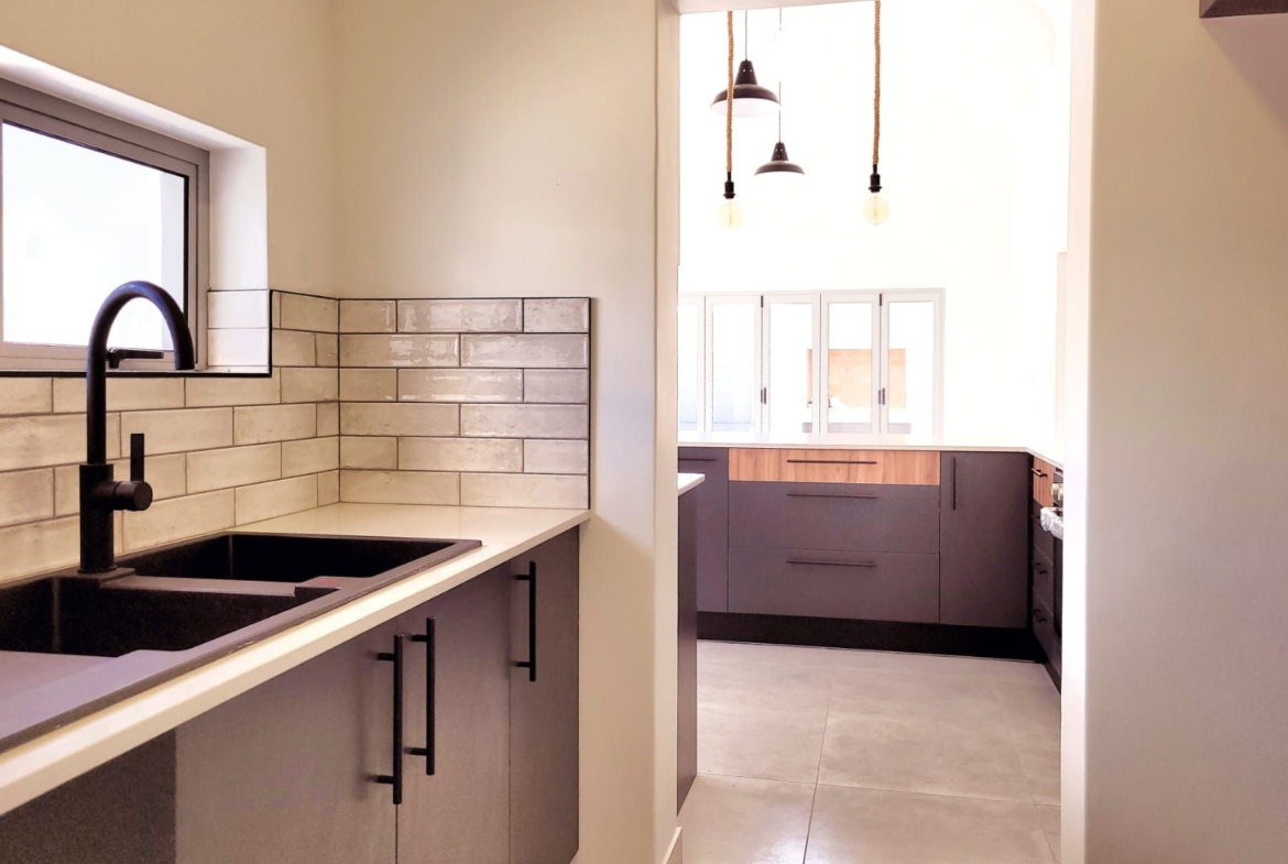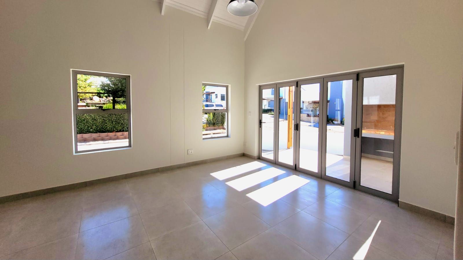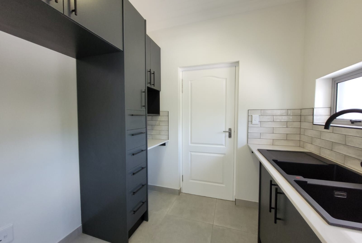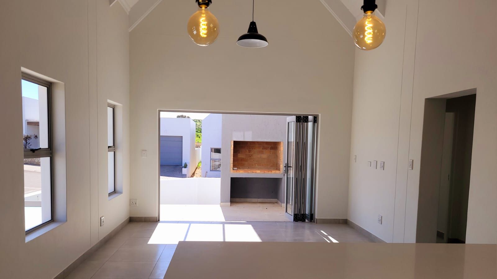 The heart of the home is its open-plan kitchen and living area, a space designed for connection. Stacking doors open onto a sunlit patio, seamlessly blending the indoors with the outdoors. The built-in braai turns everyday living into an experience of fresh air, sunshine, and the gentle sounds of nature.
