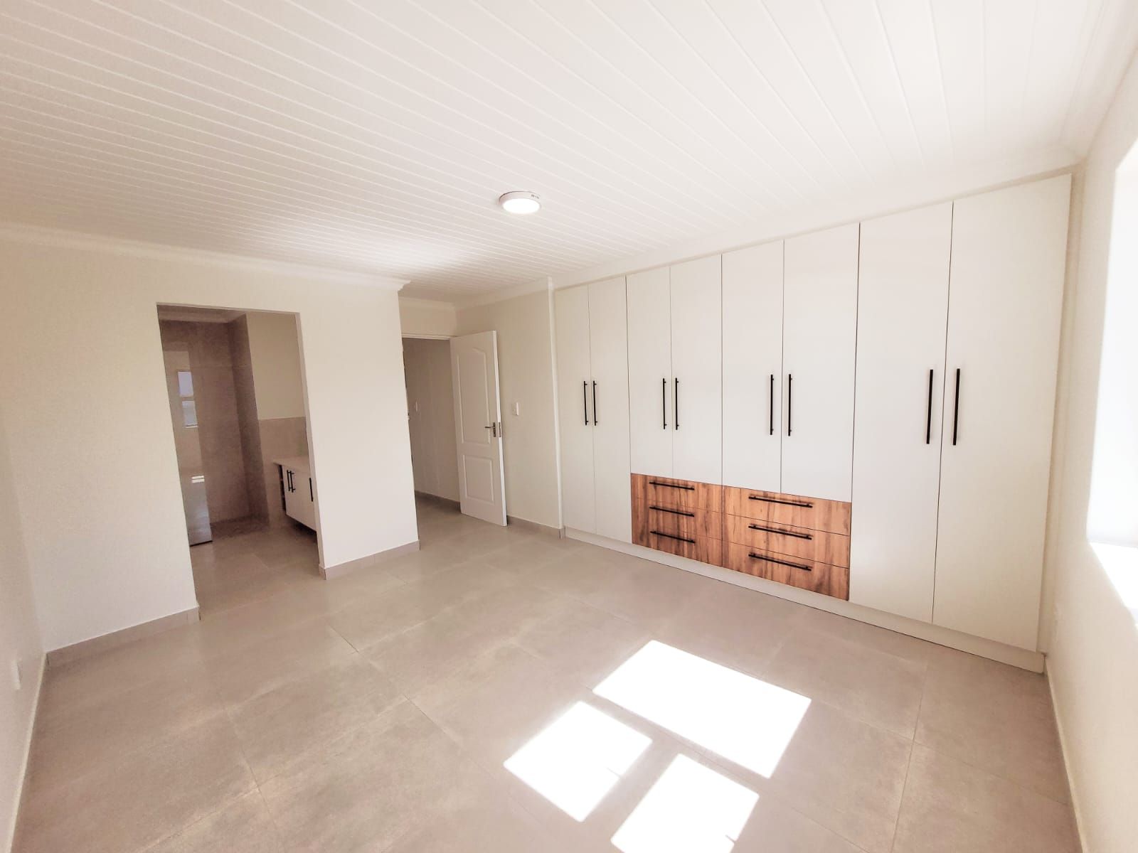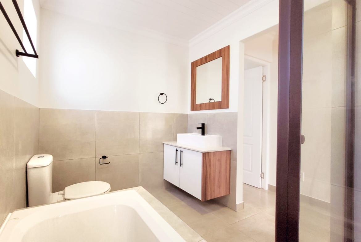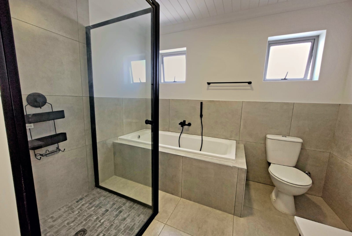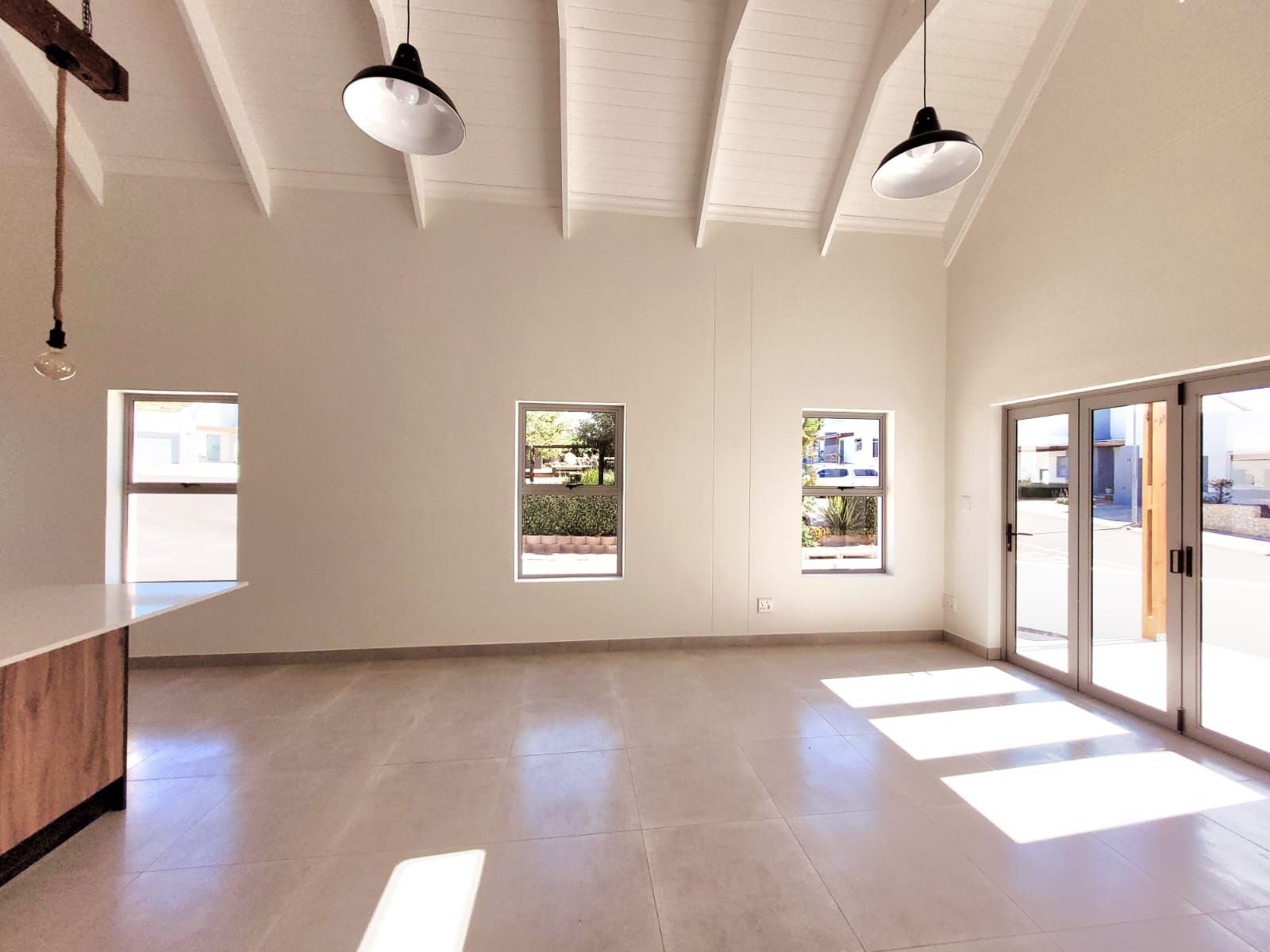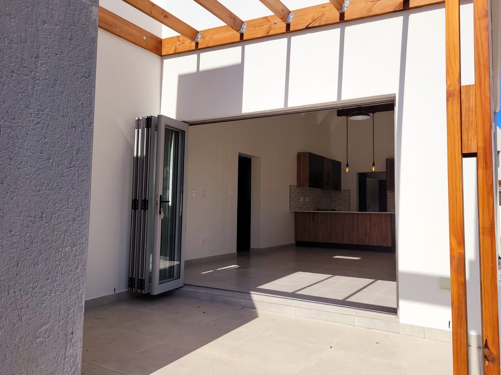 The heart of the home is its open-plan kitchen and living area, a space designed for connection. Stacking doors open onto a sunlit patio, seamlessly blending the indoors with the outdoors. The built-in braai turns everyday living into an experience of fresh air, sunshine, and the gentle sounds of nature.
