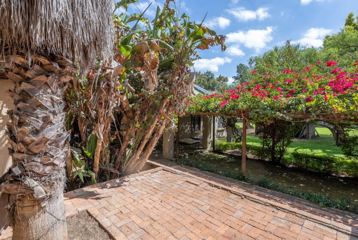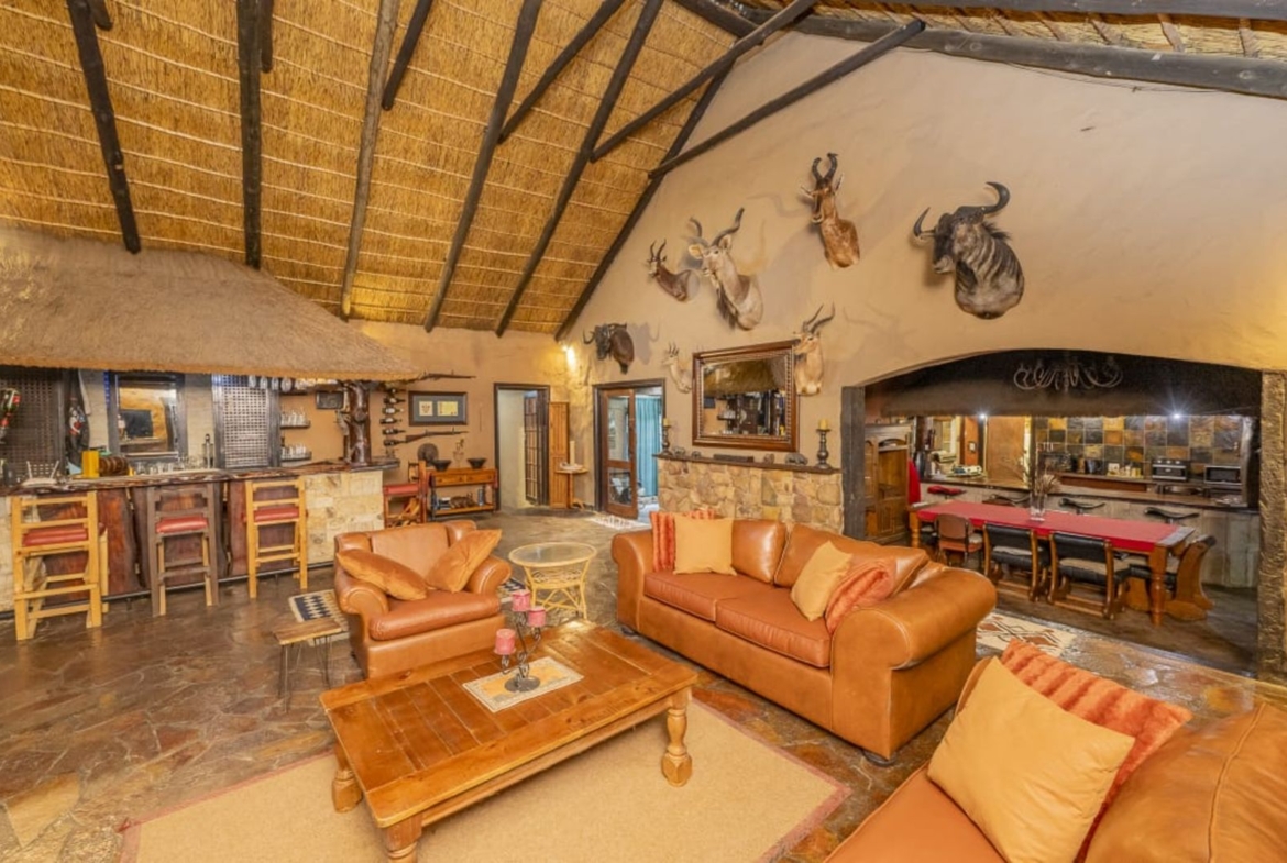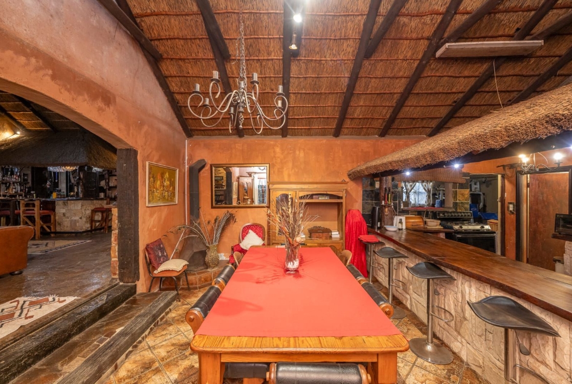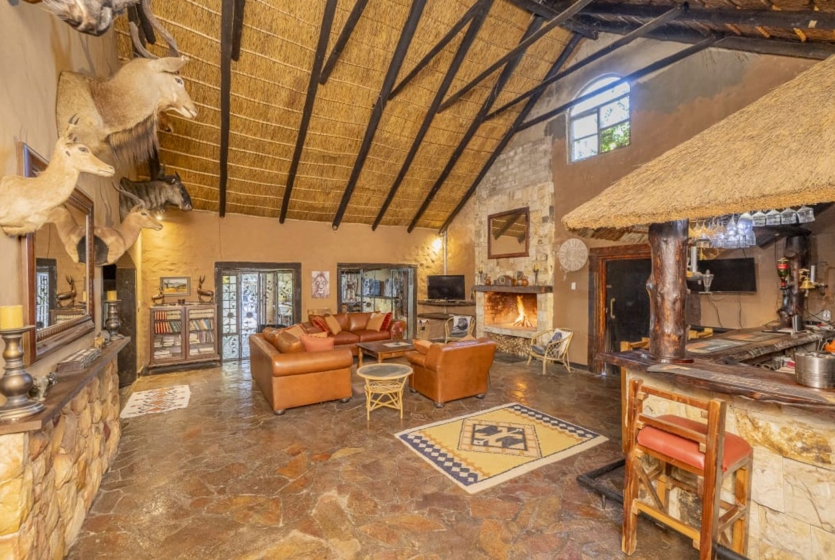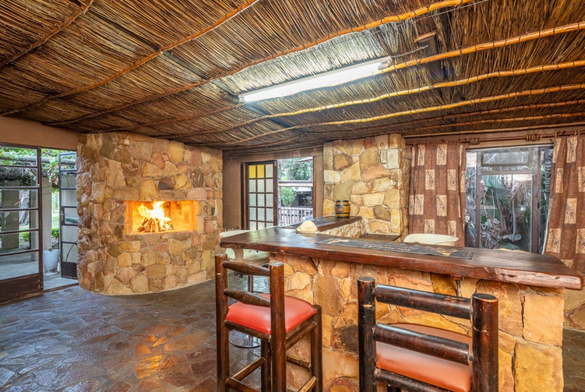 Safari Lodge-Style Retreat: (Main house) This unique home offers an indoor fireplace and braai room, an outdoor Lapa and braai area, a jacuzzi room, bar, wine cellar, beautifully landscaped gardens, a duck pond, and an impressive double entrance.