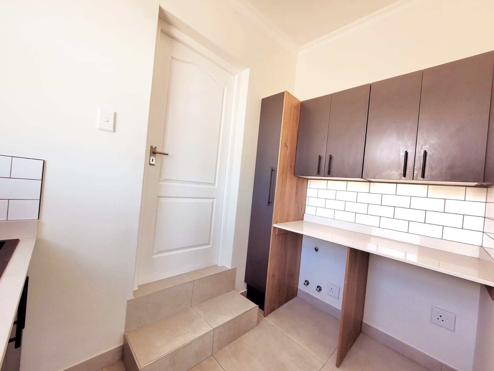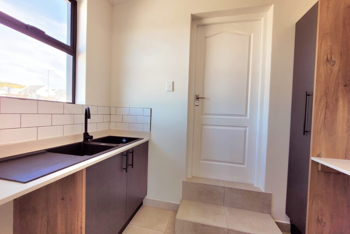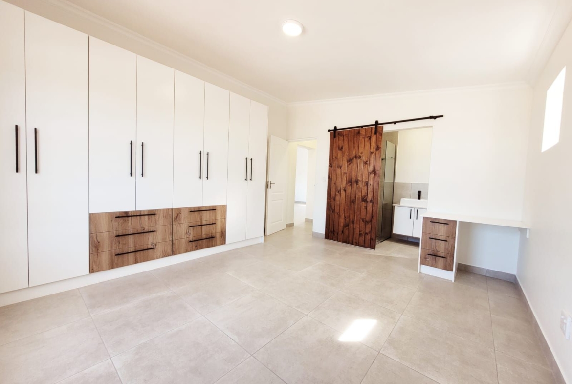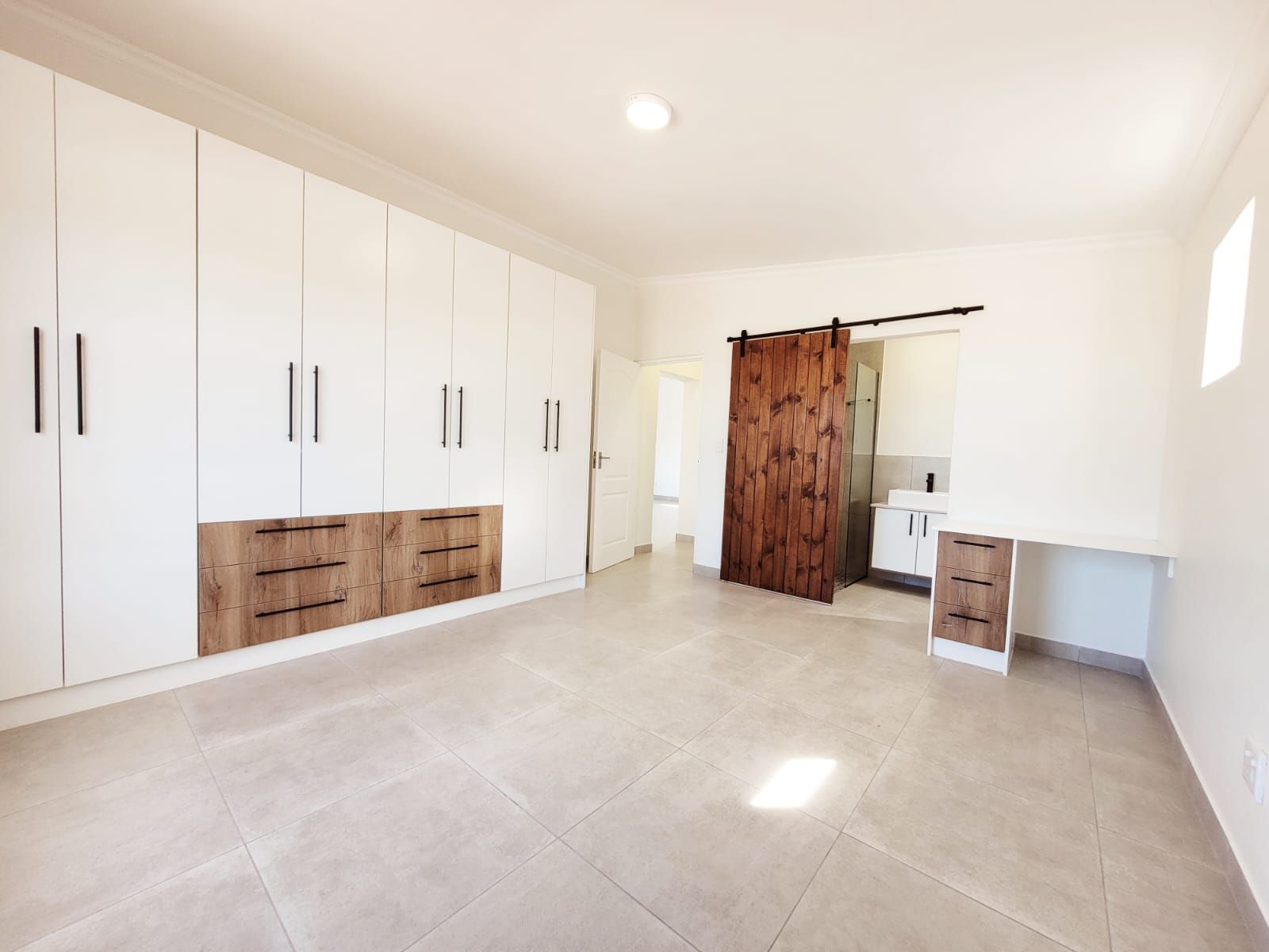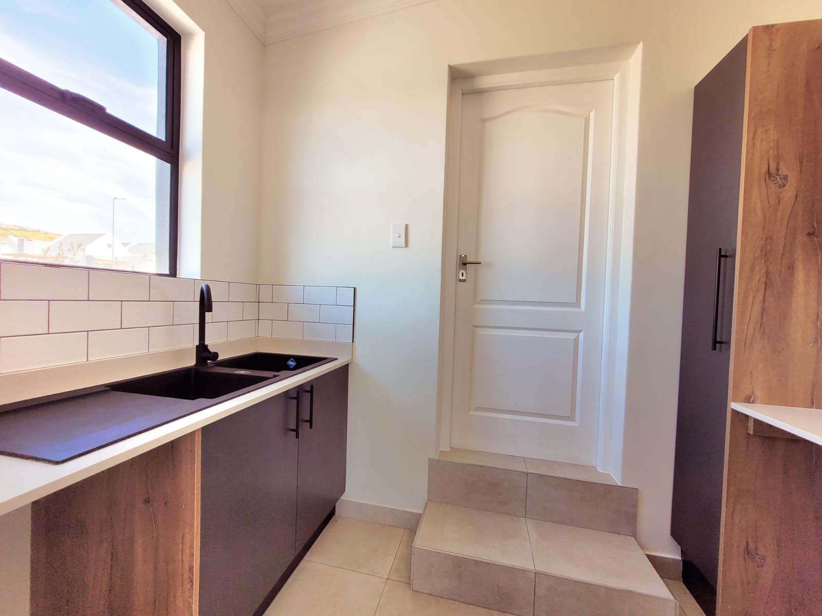 The house offers beautiful open plan living areas, with a built in braai, and a modern kitchen which comes with engineered stone counter tops which are durable and also adding a touch of elegance to the kitchen. There is a separate scullery/laundry room with space for a dishwasher, washing machine as well as tumble dryer.