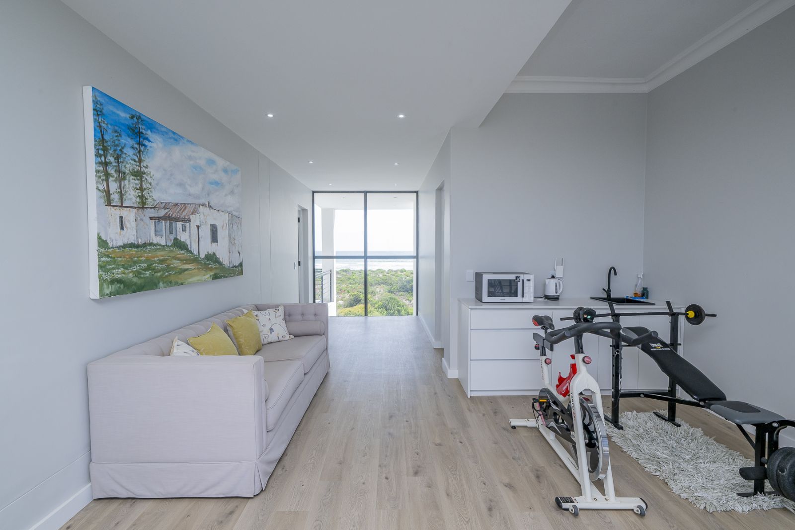 Entertainment & Leisure – upstairs lounge with kitchenette, gym space, and panoramic windows.