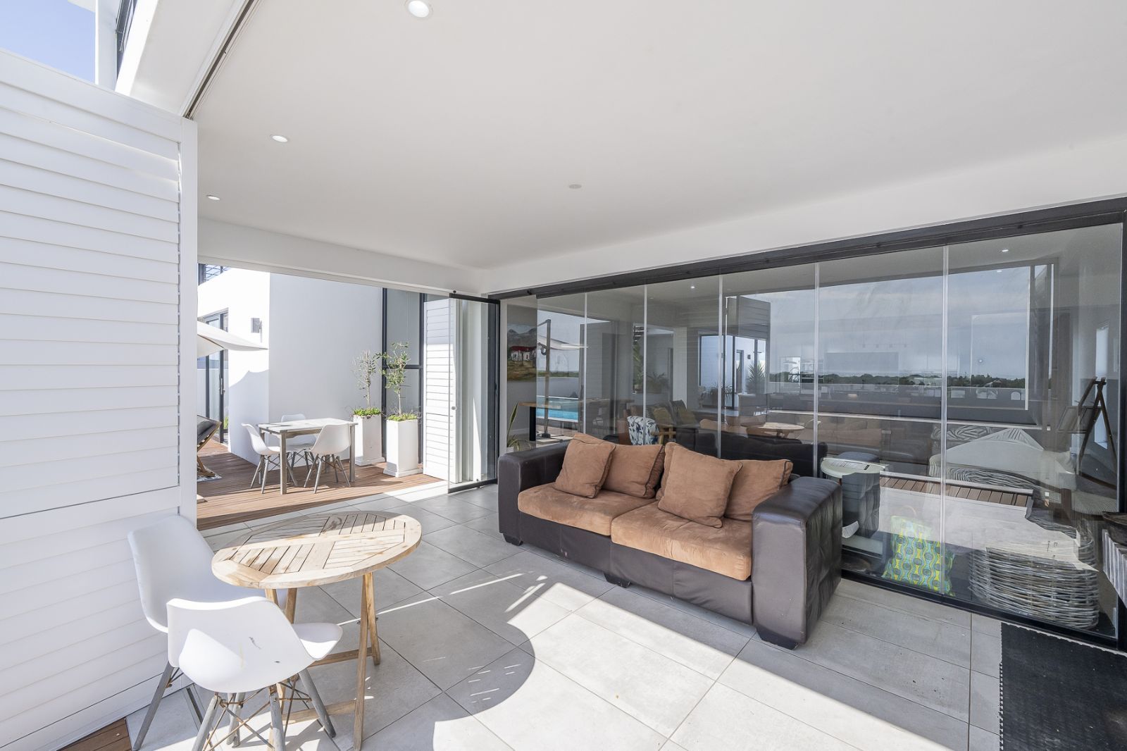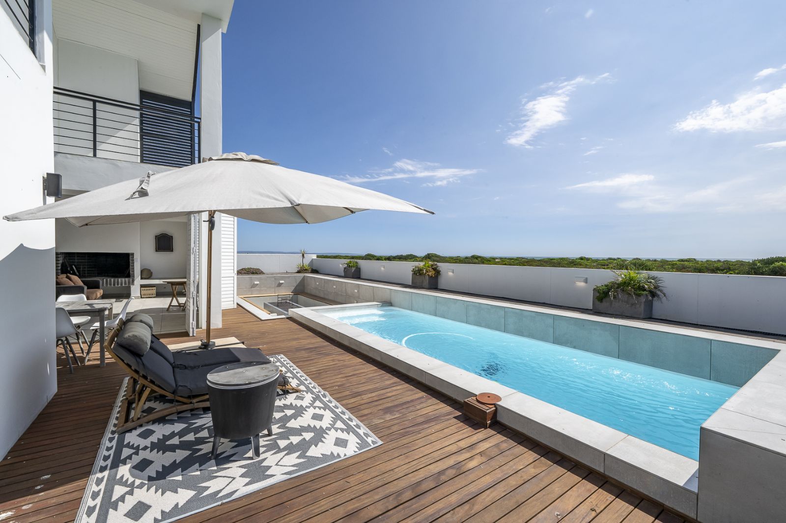 Indoor–Outdoor Lifestyle – pool, firepit, enclosed braai room, and Grepa decking.