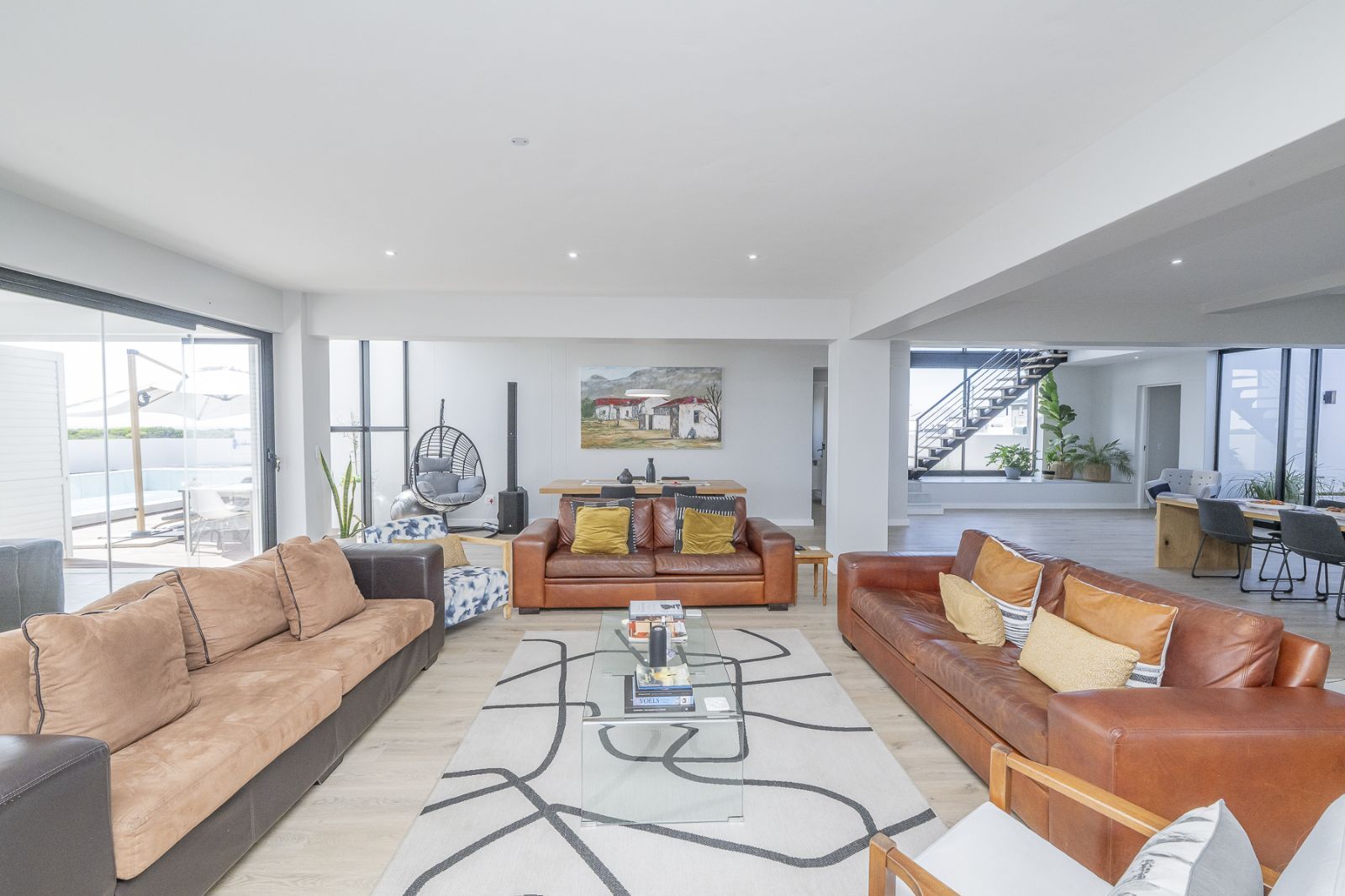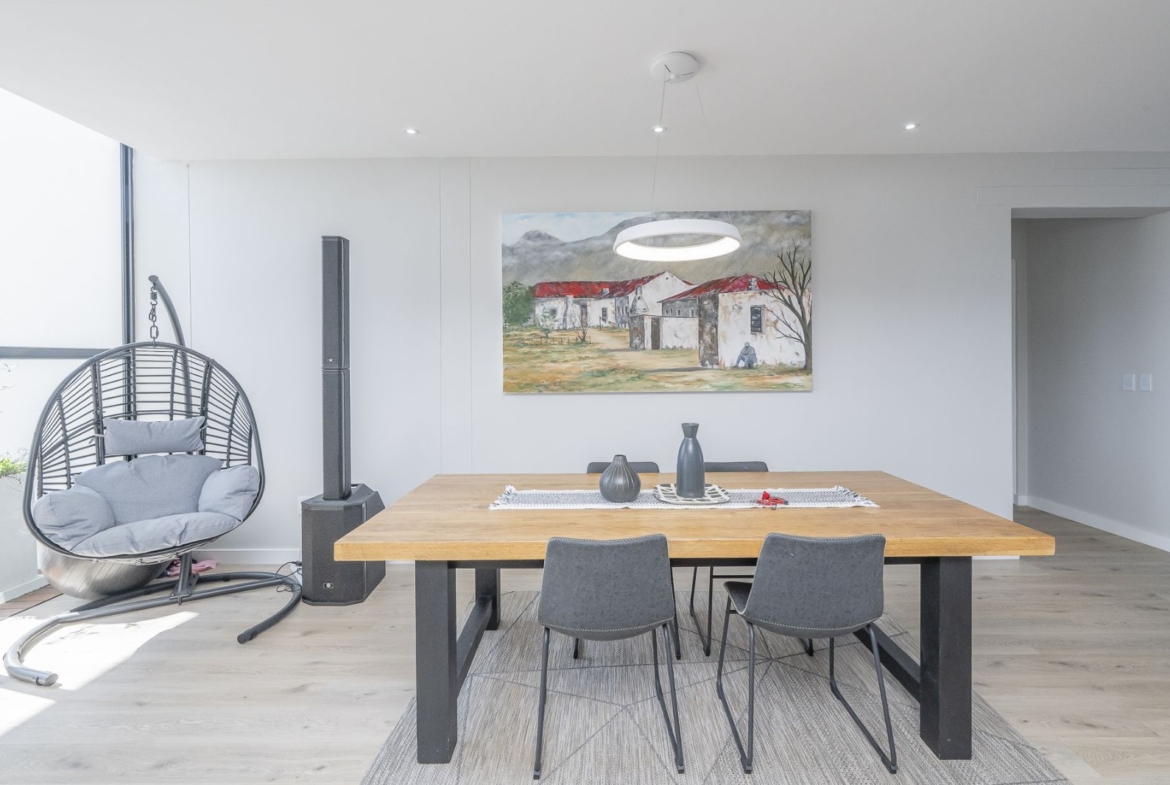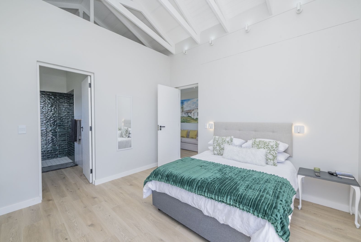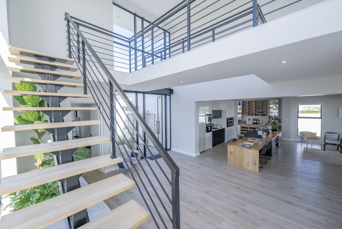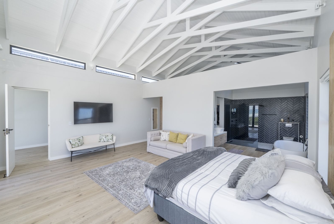 From sun-drenched living spaces with soaring ceilings to the seamless flow of frameless stacker doors opening onto a pool, firepit, and enclosed braai room, every detail of this home has been designed to embrace both comfort and style.