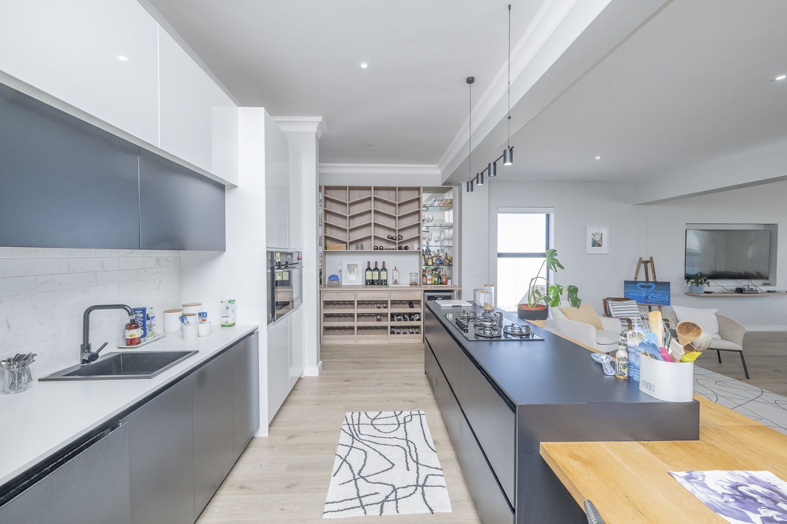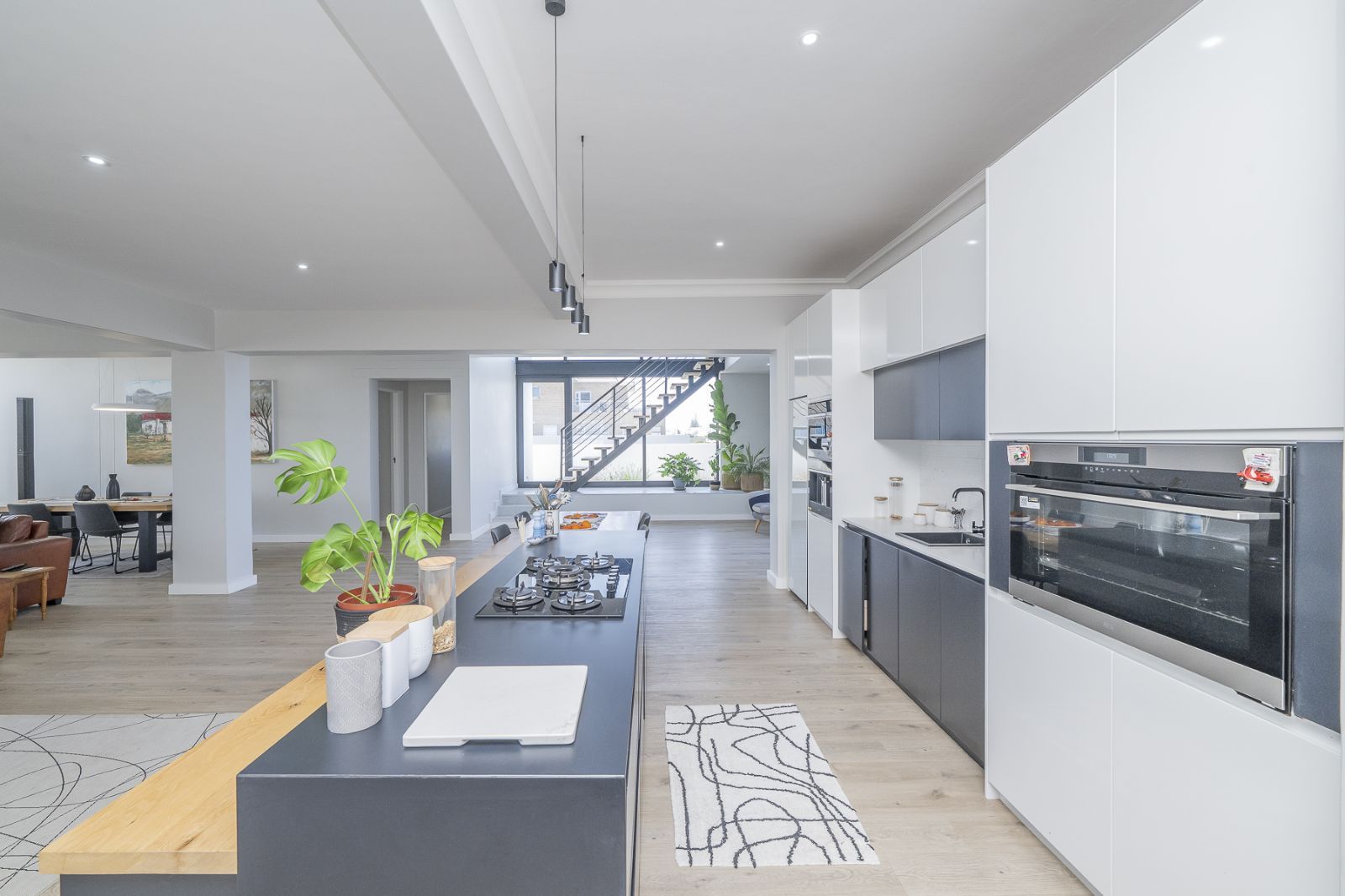 Gourmet Kitchen – Bosch built-in coffee machine, AEG steam oven, Whirlpool convection microwave, Grundig 5-burner hob, and separate scullery with hidden storage.