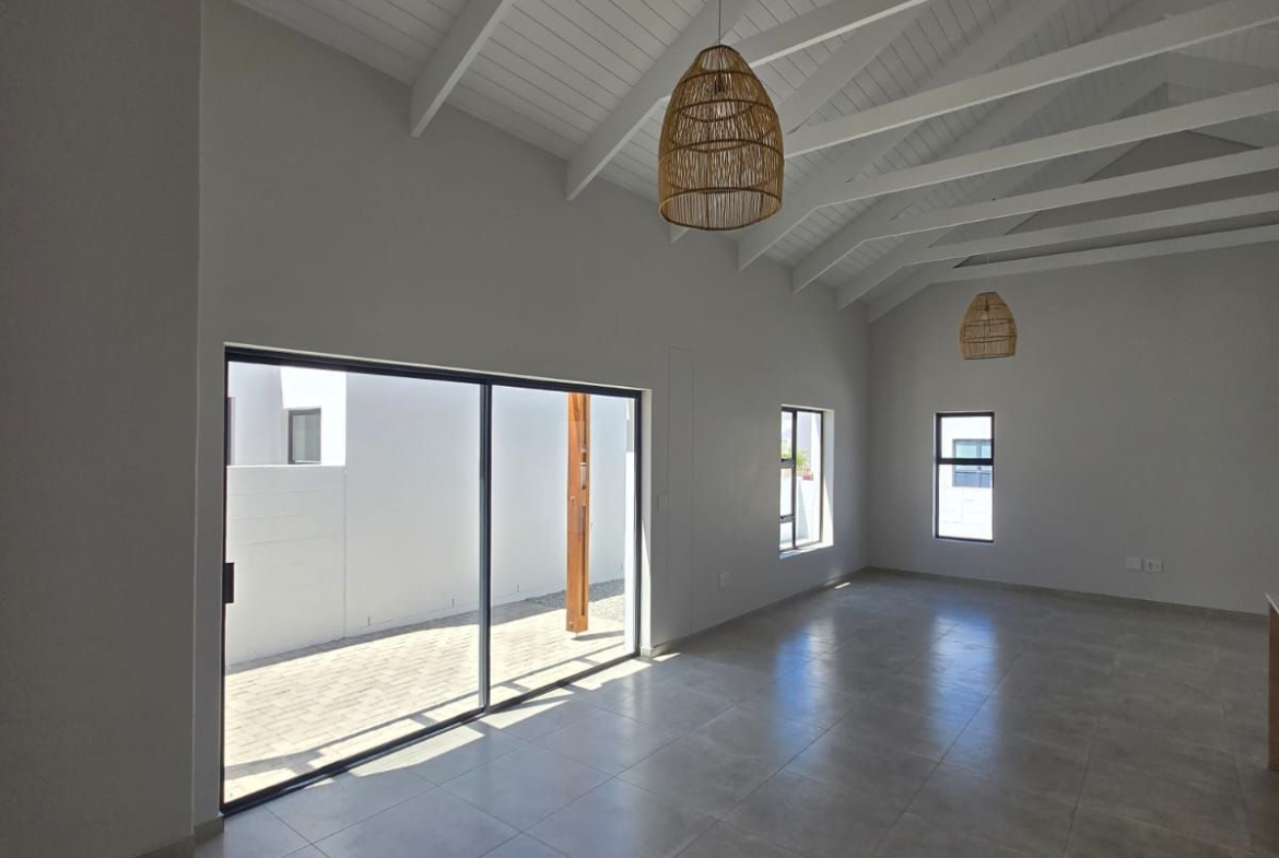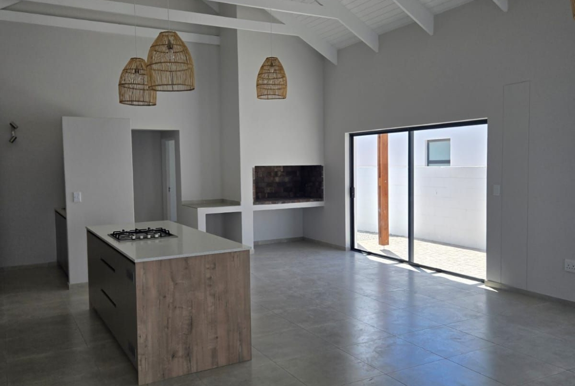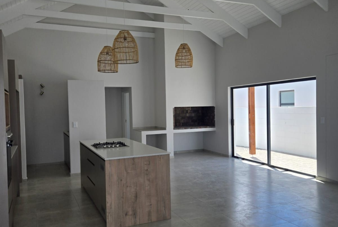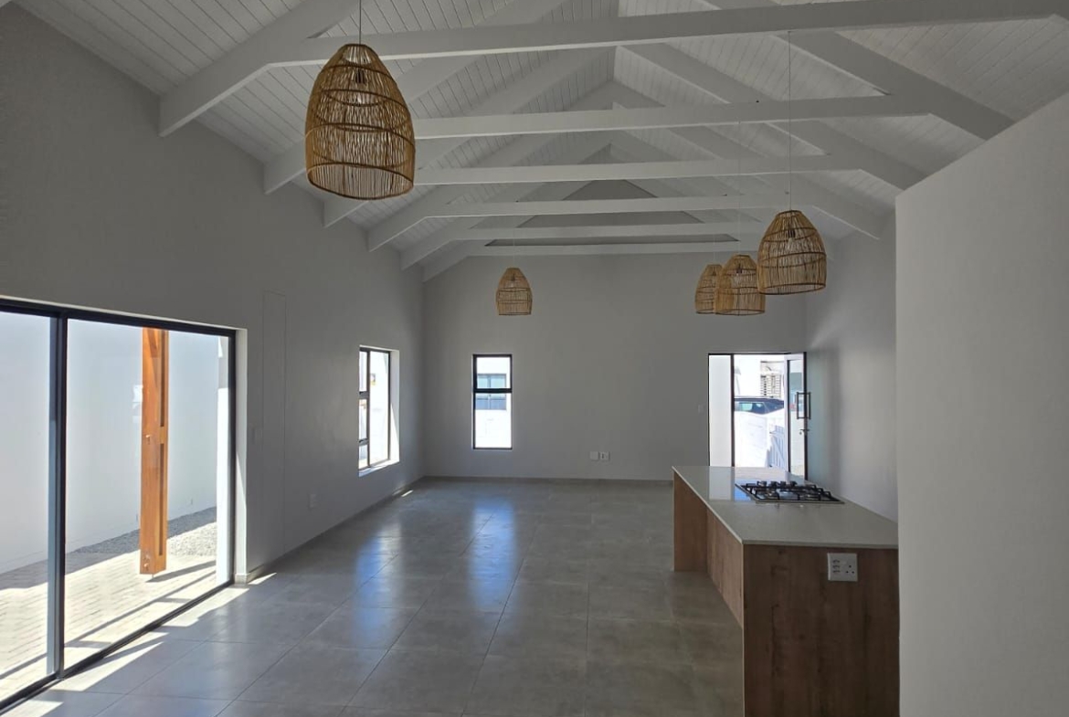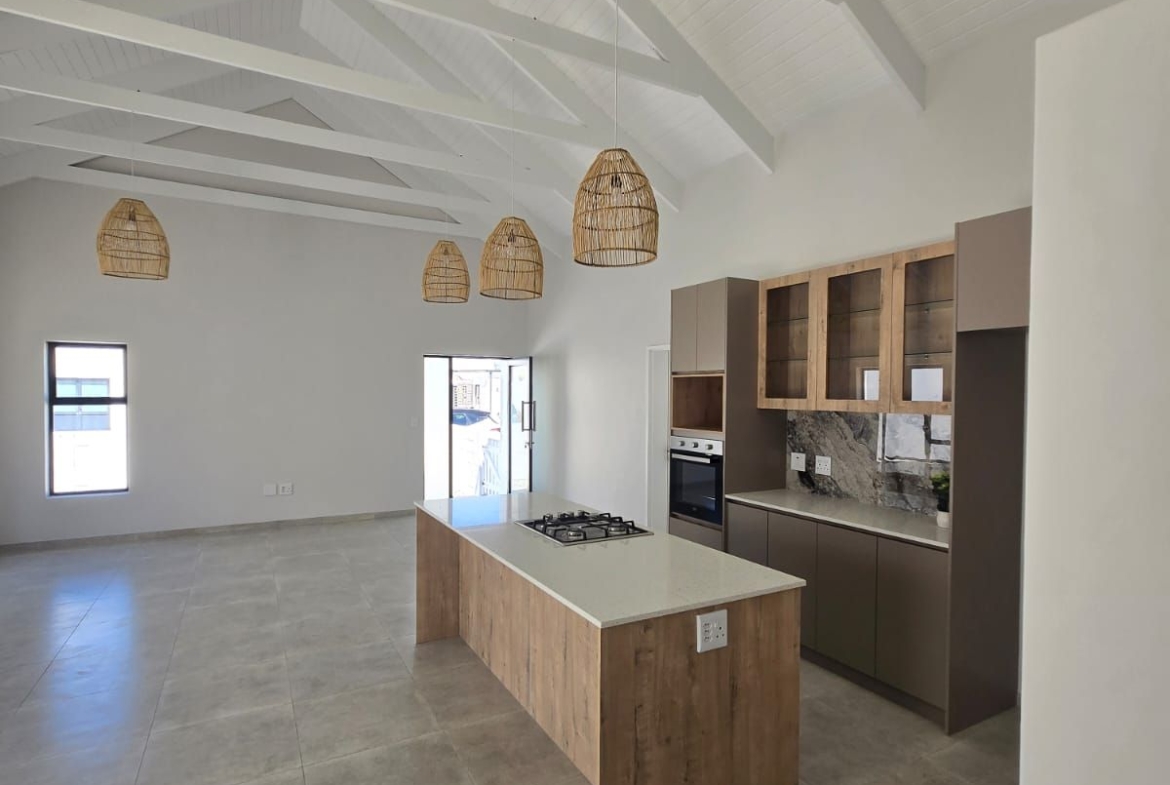 Inside, you’re greeted by spacious, sunlit rooms featuring open trusses, luxurious finishes, and a thoughtfully designed layout. The modern kitchen, complete with gas stove and scullery, flows seamlessly into the dining area and lounge, perfect for relaxed entertaining. A built-in indoor braai enhances the space, making it ideal for gatherings year-round. The home also includes 2 comfortable bedrooms, 2 stylish bathrooms, and a private office/study, ideal for remote work or creative pursuits.